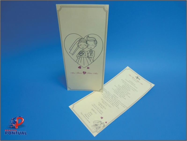 Portfolio Início Portfolio Exibição Projeto: Menu Tipo: Menu de Casamento Tamanho: 10x20 Quantidade: A que você precisa! Breve descrição: Papel Telado 180 gr