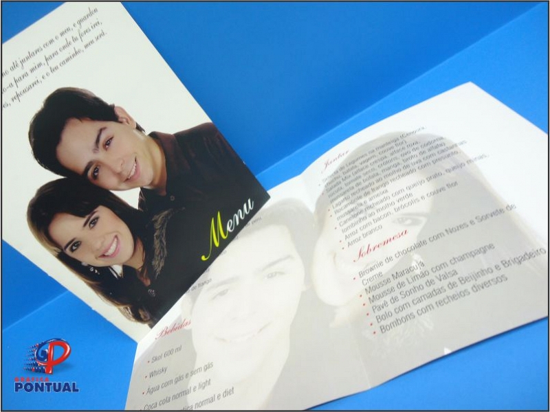 Portfolio Início Portfolio Exibição Projeto: Menu Tipo: Menu de Casamento Tamanho: A4 Quantidade: A que você precisa! Breve descrição: Papel Couche 210 gr
